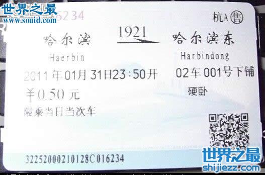 在几年前,中国最便宜的火车票只要5毛钱,且看下图,是哈尔滨到哈尔滨东,还有一条线路是哈尔滨东到滨江,售价均是5毛钱,而且还是卧铺哦!是不是突然感觉,生活中国还是非常幸福的啊!