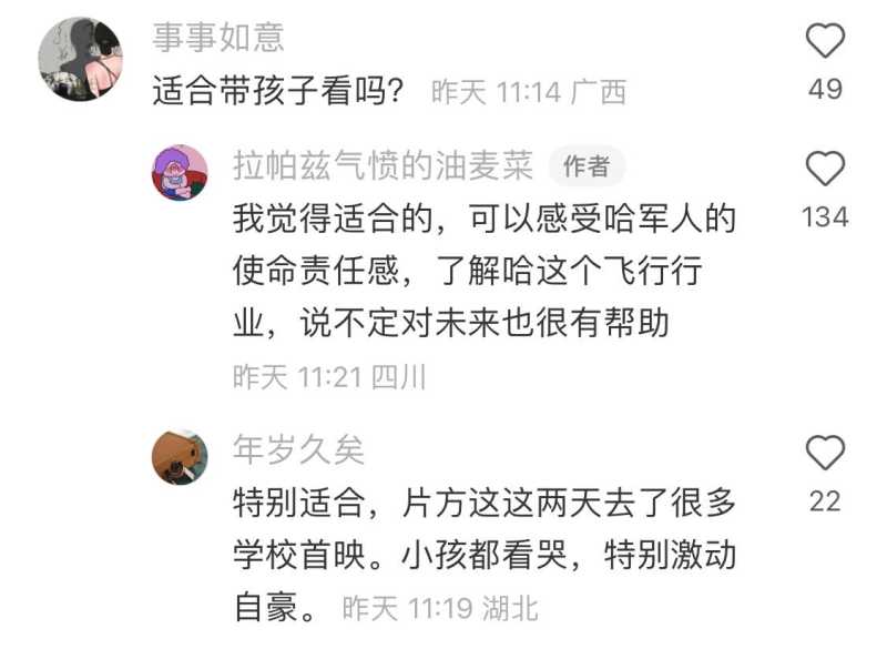 除了展示中国空军的实力之外,我认为《长空之王》这部电影更重要的意义是足够尊重事实,向观众展示了整个研发过程的不易。没有人能随随便便成功,也没有什么事能随随便便成功,即便我们举全国之力在推进,也会遇到重重困难。对于小朋友来说,他们的人生才刚刚开始,以后都难免遇到各种风风雨雨,《长空之王》中主演们面对困境时的态度,以及化解危机的智慧,都将给小朋友们带去重要的教育和启发,帮助他们更好地面对未来的坎坷。