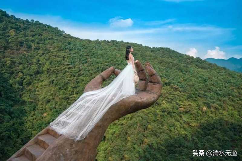 在海拔数百米高的悬崖绝壁之上,一只巨大的佛手凭空伸出数十米,对着天空摆出拈花的姿势,如同一尊圣洁的莲花宝座。沿着佛手台阶而上,置身掌心,四周风景尽收眼底,颇有日月照禅心的感觉。