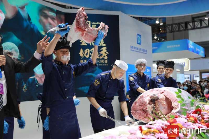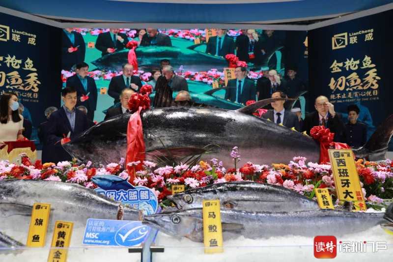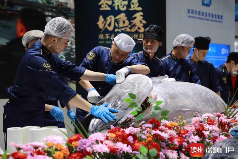 5月12日,2023深圳国际渔业博览会现场,深圳市联成远洋渔业集团推出400公斤重的蓝鳍金枪鱼王。这也是国内会展史上吨位最重的深海鱼王。多名切鱼师联袂献技“开鱼”仪式,赢得超高人气。记者多图带您饱览味觉与视觉的盛宴!