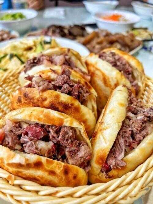 先说驴肉火烧,河北主要分为“河间派”和“保定派”。河间驴火长长的、薄薄的,外面一层金黄的脆皮,一口下去,嘎吱一声,脆皮粉碎性掉渣,里面却十分松软。