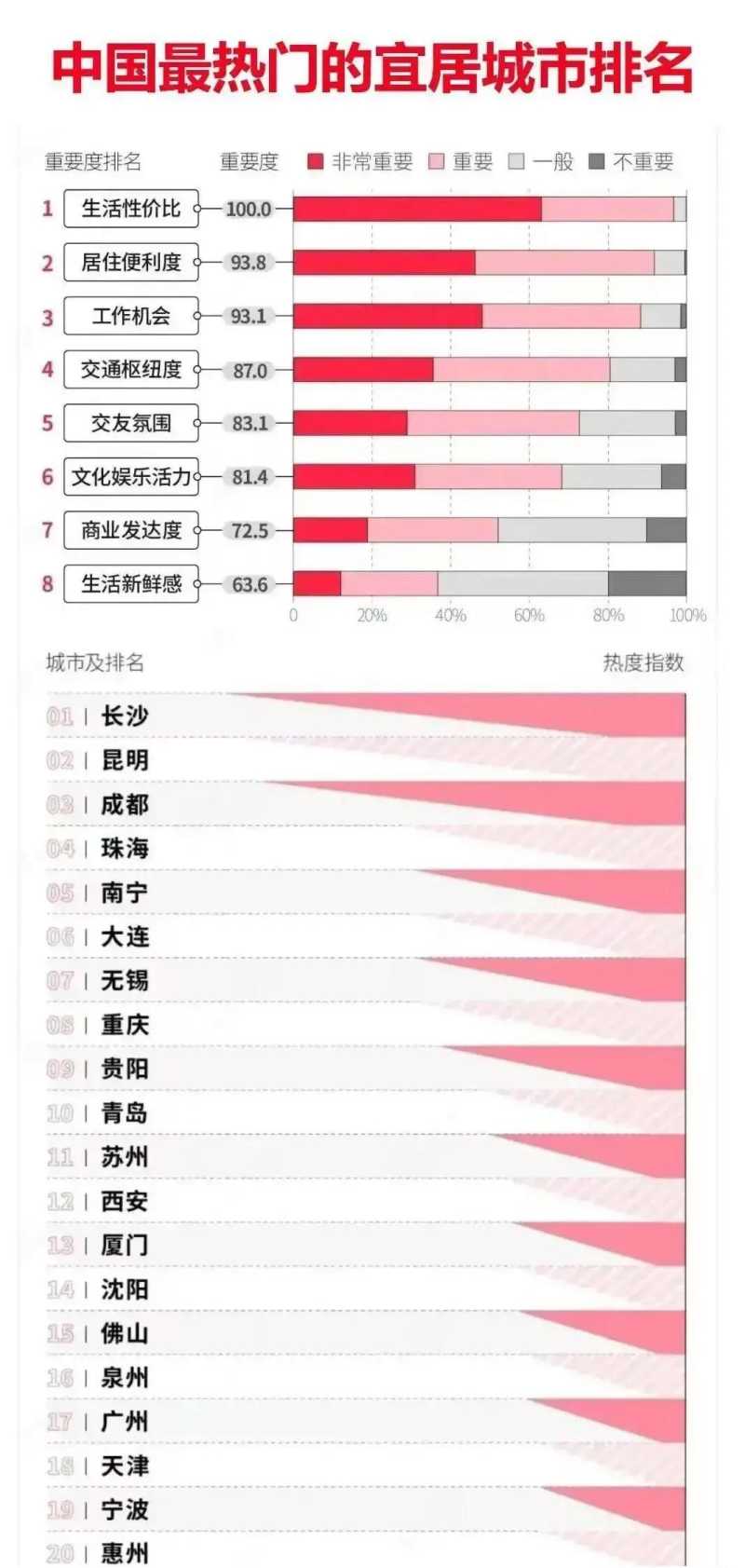 除此以外,还有大连、无锡、重庆、贵阳等多座城市上榜,这些城市整体来看,也都有上榜的实力,还是非常不错的。有意思的是,在排名前二十的城市中,我们传统意义上的四大一线城市北上广深,只有广州入选,而且排名也很靠后,在18位,四大一线城市出现这样情况能理解,因为一线城市的生活压力真的是太大了。