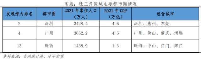 No.2 深圳都市圈:年轻移民的创业天堂,经济大市、土地小市。1)深圳都市圈人口和经济高速增长,是年轻人的创业天堂,也是珠三角城市群的“硬核”之一,与广州都市圈形成“双足鼎立”发展格局。2)深圳都市圈已经从深圳向莞惠单向梯次转移发展为区域内产业融合发展、外溢与回流并存,目前深莞产业融合明显。3)深圳是经济人口大市、土地面积小市,全市面积仅1997平方公里,通过行政区划调整解决发展空间不足的可能性长期存在。