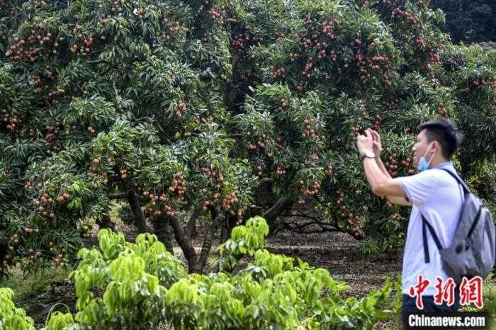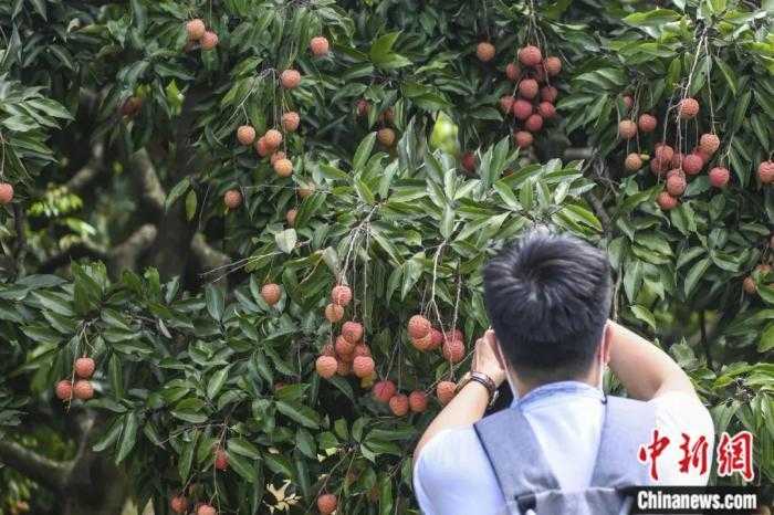 广东省广州市成熟的荔枝吸引游客。陈骥旻 摄