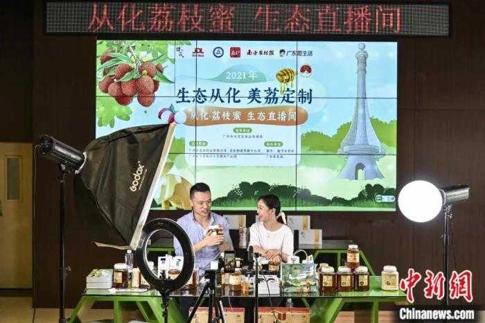 2021年,广东省广州市,两名主播通过网络直播介绍荔枝。陈骥旻 摄