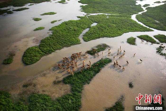 麋鹿在水中奔跑。(资料图) 江苏大丰麋鹿国家级自然保护区供图