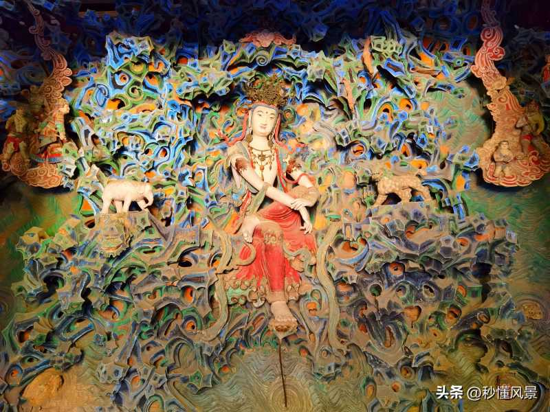 东方美神一倒坐观音,摩尼殿内槽北壁一座泥塑五彩悬山,上有塑像数十尊,正中为五彩观音菩萨像,俗称“倒坐观音”此像重塑于明嘉靖四十二年(1563年)。倒坐是指观音菩萨不坐在大殿的正中央,而在后壁倒坐。观音菩萨左足踏莲,右足屈膝搭于左腿上,右手绕右膝轻抚左腕,姿态优雅端庄,自在大方。她的庄严令人畏而起敬,她的美丽令人恭而不亵,她那人格化了的仪表。