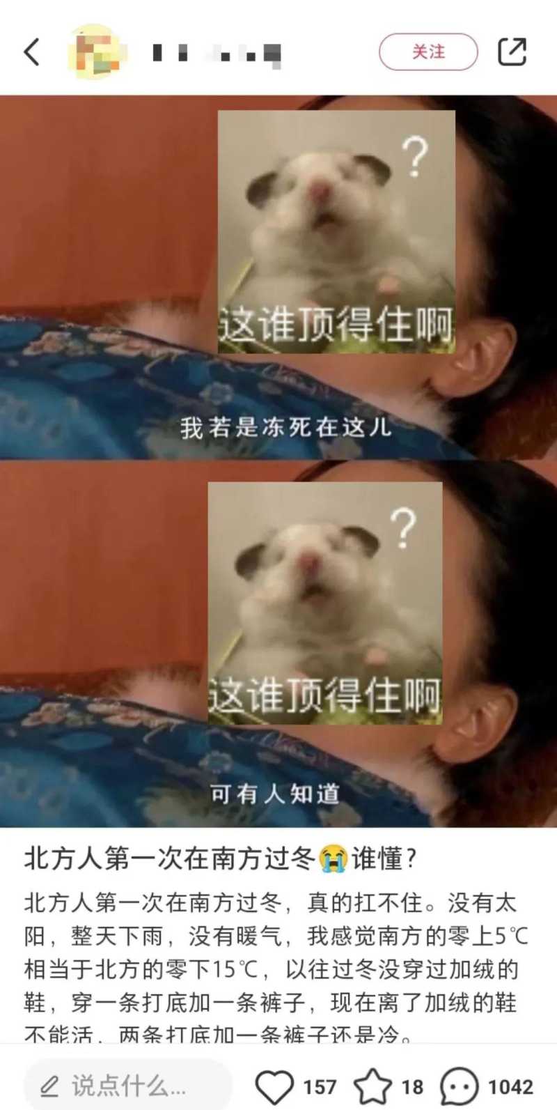 北方人则在南方冷空气的“魔法攻击”下,捂得严严实实,蜷缩在被窝里怀疑人生。
