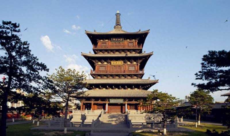 释迦塔全称佛宫寺释迦塔位于山西省朔州市应县城西北佛宫寺内,俗称应县木塔。是中国现存最高最古的一座木构塔式建筑。与意大利比萨斜塔、巴黎埃菲尔铁塔并称"世界三大奇塔"。