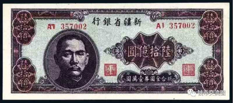 1949年新疆商业银行孙中山像陆拾亿元 九五品