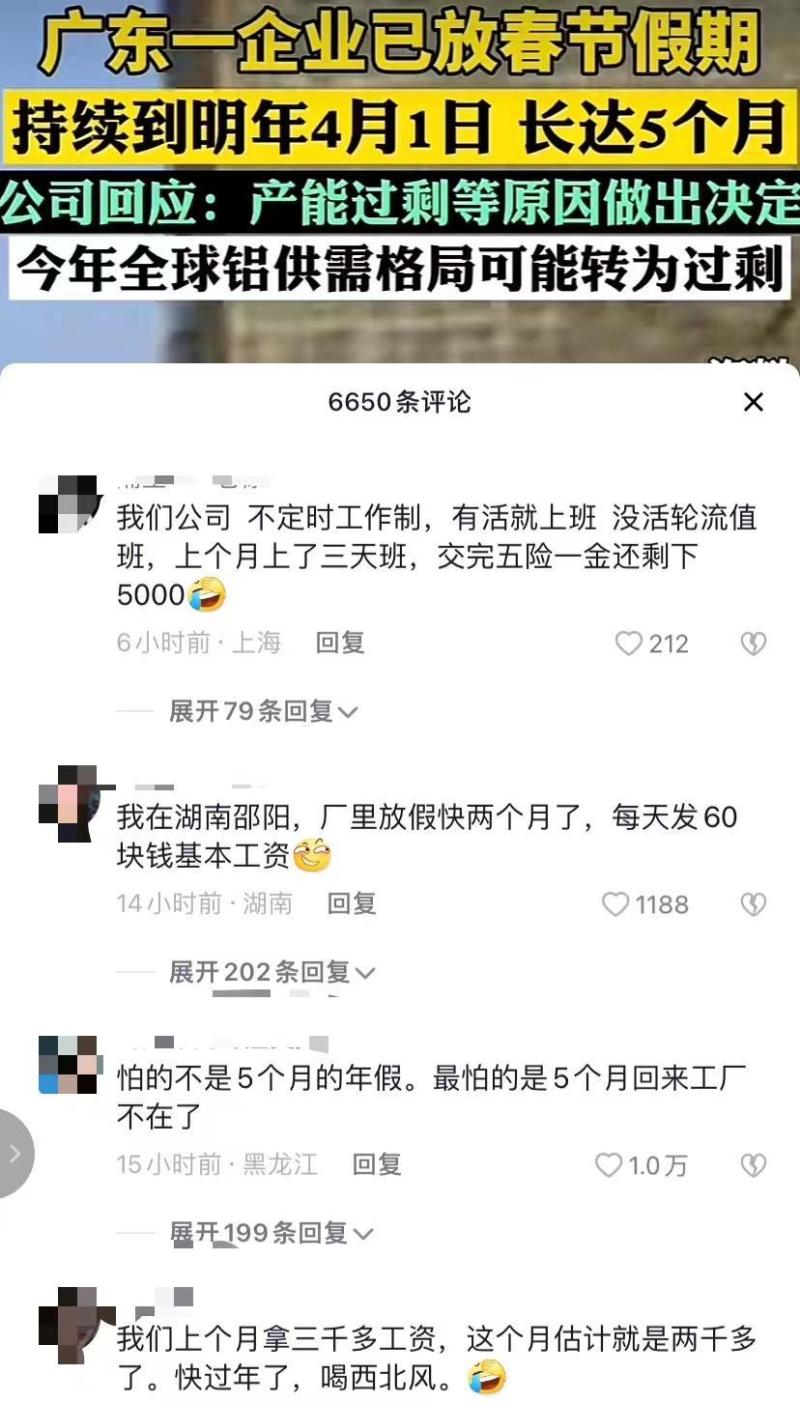 2023年,受全球铝供需求骤减,导致广东省佛山市的金世界创新铝业有限公司产能过剩等原因导致订单下降。该公司发布公告宣称:从11月9日开始提前放春假,时间持续到2024年4月1日,假期长达近5个月。