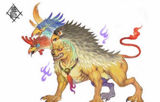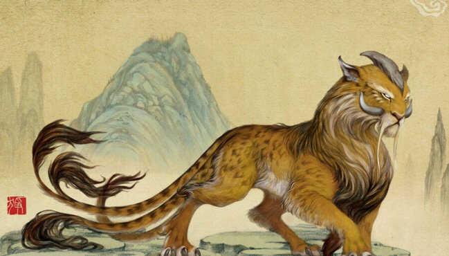有点像我们今天的豹子,但是头顶有一只尖角,身后有五条尾巴,叫声像是石头在一起撞击一样。
