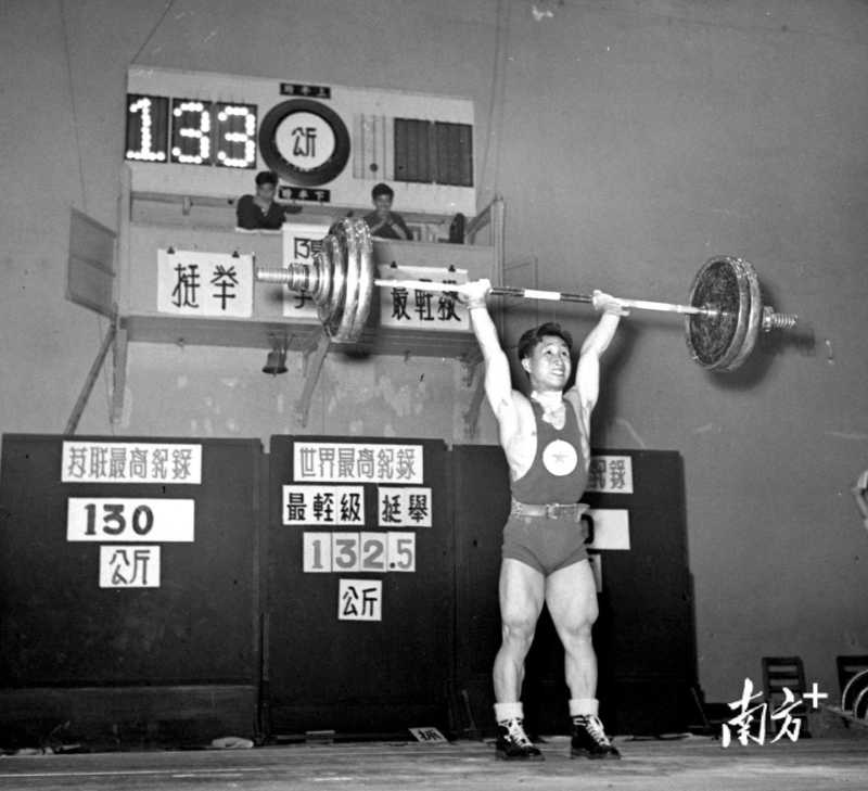 1956年6月,陈镜开以133公斤的成绩打破最轻量级挺举世界纪录,创造了中国第一个世界纪录。新华社资料图