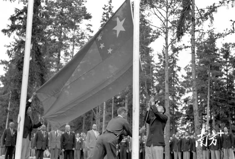 1952年7月29日,参加第15届奥运会的中国代表团抵达赫尔辛基后,在奥运村举行升旗仪式。新华社资料图