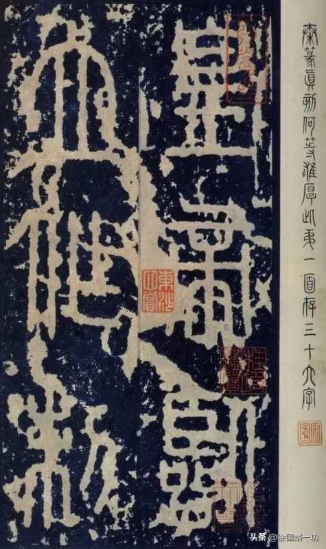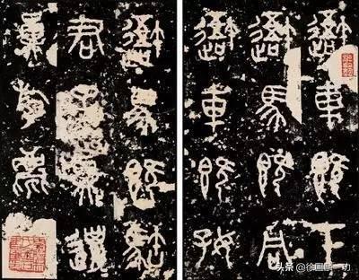 石鼓文,秦刻石文字,因其刻石外形似鼓而得名。其书法字体多取长方形,体势整肃,端庄凝重,笔力稳健,石与形,诗与字浑然一体,充满古朴雄浑之美。