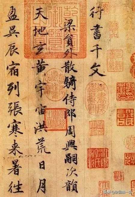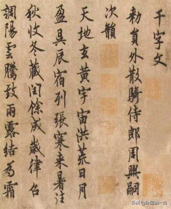 南朝时期,梁武帝肖衍为了教诸王书法,让殷铁石从王羲之的作品中拓出了一千个不同的字,每个字一张纸,然后把这些无次序的拓片交给周兴嗣,周将其编成了有内容的韵文,这就是流传至今已1400多年的《千字文》。