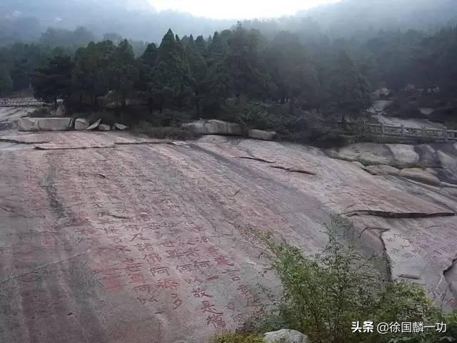 《泰山金刚经》,摩崖刻石。南北朝时刻于山东泰安县泰山经石峪花岗岩溪床,没于水下千年,泉水改道,始见天日。刻石南北长五十六米,东西宽三十六米,约计两千多平方米,是汉字刊刻面积最大的作品。