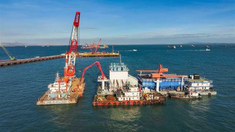 基坑换填采用一艘搅拌船加一艘浮吊船架设导管方式施工,共换填混凝土2万余立方米,创下无围堰状态下混凝土浇筑方量的国内之最。