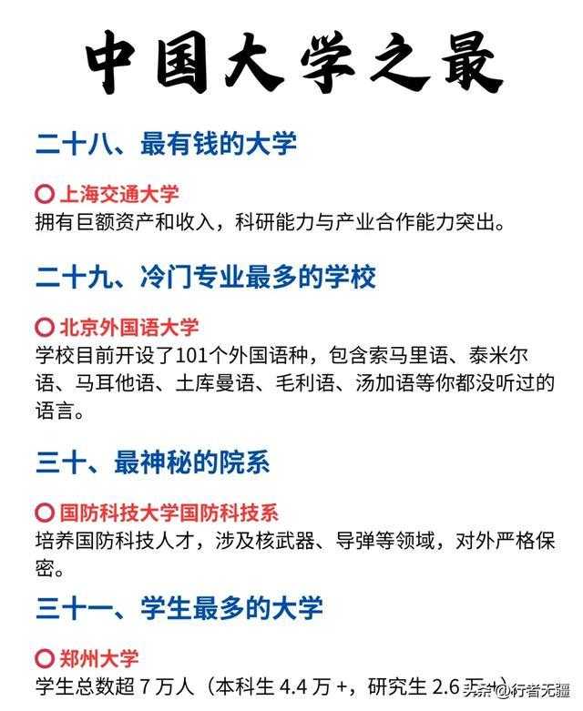 以下是整理好的中国大学之最,分为三十一个类别,包括但不限于:进步最快的大学、最少人知道的985大学、最神秘的大学等等。