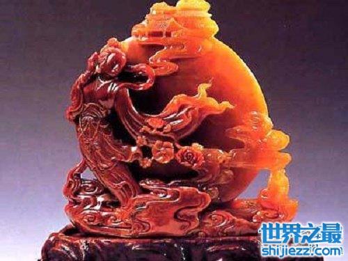四大名石巴林石的开采历史可以追溯到距今六千年前的“红山文化”时期。历经了辽代及明清,曾经辉煌一时。 曾为清朝摄政王多尔衮的属地——喀啦沁旗锦山的灵悦寺内,供奉着一尊石佛(高14厘米、宽7厘米、厚4.5厘米),其石质属巴林石中的粘性料,玫瑰色,其中有三分之一的杂质。因属朝产,多年供奉,具体资料已无从考证。观察石佛,与众不同,头罩佛光,面部雍容富态,带发罩,露出两根辫子,服饰为窄袖长袍,衣纹线条流畅,手托一朵含苞待放的莲花,盘坐在莲花台上,应该说,这是一位公主,刻成了佛的形象。从雕刻手法上看,此佛应是唐宋时期所刻。 有文字记载:成吉思汗统一蒙古各落的庆功宴上,属下奉献一只巴林石碗,