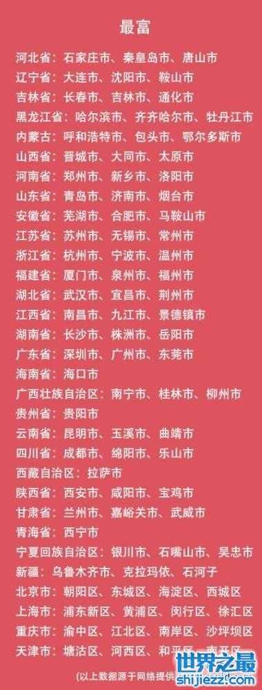 下面我们来中国各省最富有的城市和各省最穷的城市排名,赶快看看你的家乡是不是榜上有名: