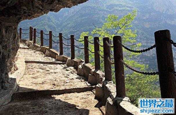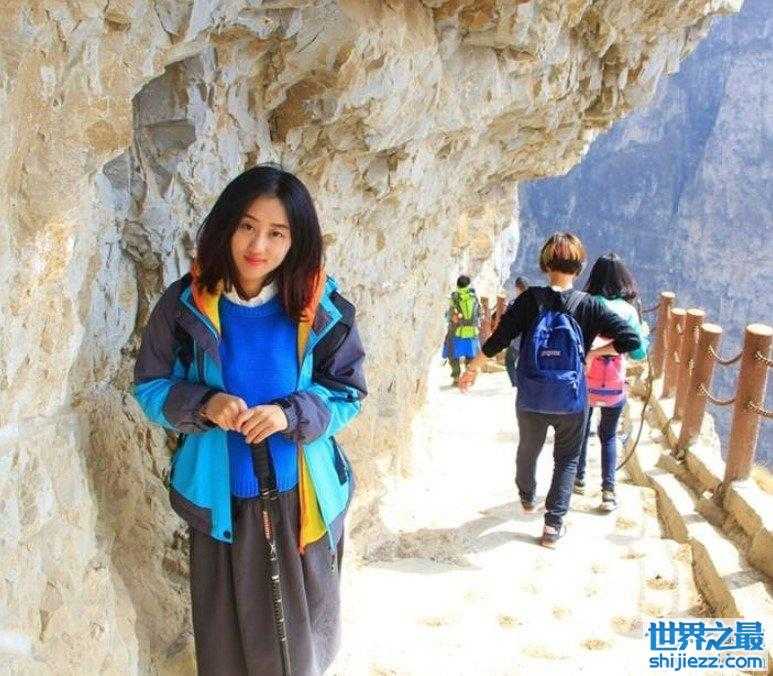 一边是峻峭的山墙,另一边是深渊,吼叫着的狂风吹得人们站不稳的脚。这条路崎岖难走。走在路上,几乎不敢往下看。看着对面的山崖,头都有点晕。2004年,当地人终于在岩壁上挖出了一条“天路”,打开了与外界沟通的唯一途径,一条3公里长、笔直高度近1000米、宽不到1米的“骡马路”,爬山需两个小时。