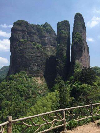 开始科普一下,三爿石的爿怎样读?不要查字典,有谁能一会儿读出来。爿的读音是pan,请记着了。三爿石就是三个高耸入云的巨石,拔地而起,形似砥柱中流,它们就像用刀劈过一样,三个顺次排开。它们离别另有名字,叫朗峰、亚峰、灵峰。它们得高度都到达了360米,被称为天下丹霞第一奇峰。