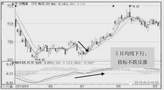 另一种情形是在股价临时横盘时代,MACD目标中的DIFF和DEA曲线都下行,乃至出现“死叉”,而5日均线却回绝下行,不跌反涨。以下图所示,股价见底反弹后,上涨了一段时候,股价曾经有了肯定的涨幅,忽然在一个平台实行休整,休整时候超出了一个月。在休整时代MACD目标中的DIFF和DEA曲线都向下运转,且 DIFF曲线下穿 DEA曲线,形成“死叉”,而此时的5日均线不只没有下行,反而有小幅微涨的趋向,二者出现背叛征象,申明此时的股价下跌是临时的,是主力的洗盘行动,后市股价将继承上涨。