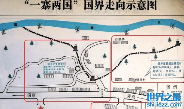 世界由五大洲、七大洋组成,国与国之间通过国境线分隔开来,国境线有山川、河流、这些自然景观,也有奇特的人文景观。今天巴拉排行榜网小编介绍给大家的是中国最豪华的边境线,一个已经被发展成景点的国境线——一寨两国。顾名思义,一寨两国是指国境线将一个傣族村寨一分为二,这条国境线分开了我国和缅甸,中方一侧的称为银井,缅方一侧的称为芒秀。