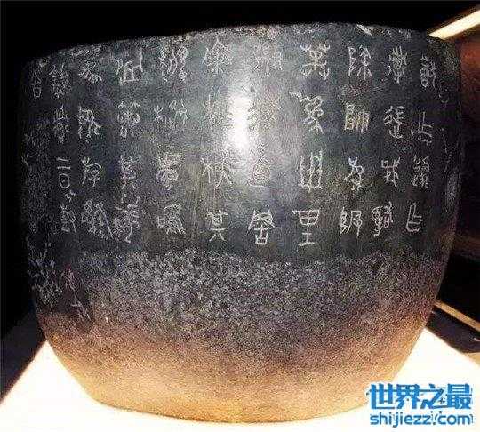 来自先秦时期的战鼓,他可以说是我们国家的镇国之宝,在公元627年就有古人发现了它流传到了现在,它具有非常多的文物价值,是因为它上面所篆刻的文字,可以说是隶书的始祖一字抵万金,上面还刻有图案,但大多数的图案都无法辨识,只能通过文字猜测出意思。