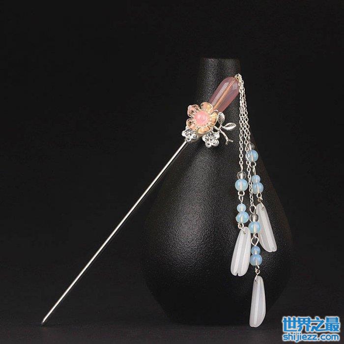 钗为珠翠和金银合制成花朵或其它 造型的发钿,连缀着双股或多股长针,用来固定发髻。使用时安插在双鬓。