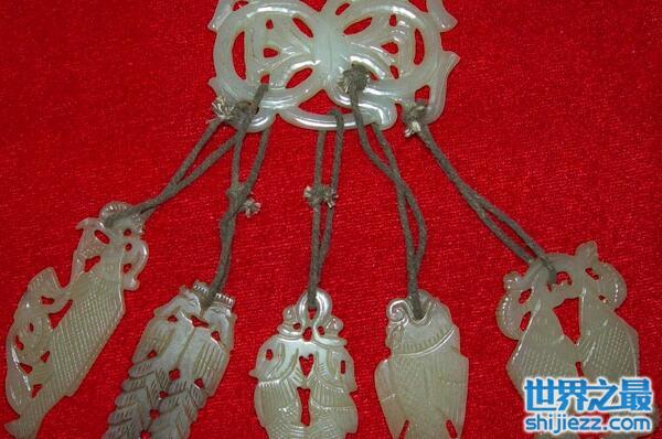 玉组佩是由53块玉共同组成的白玉质地套件,物件整体长约53.6厘米,是由五行四组共同组成,每组分别雕由麒麟、凤鸟、仙桃、双柿、四仙人等图案,通常被挂在胸腹部 ,走起路来会因玉饰之间的互相撞击而产生美妙动听的声响。