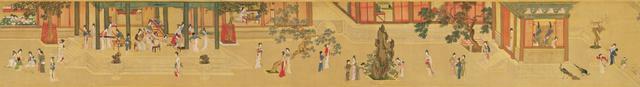 《汉宫春晓图》为明朝仇英所画,中国重彩仕女画的时代典范。描绘初春时节宫廷内的日常琐事,後宫佳丽百态比如说:折枝、妆扮、歌舞、弹唱……等等,其中包含有画师毛延寿为王昭君写像的著名故事。