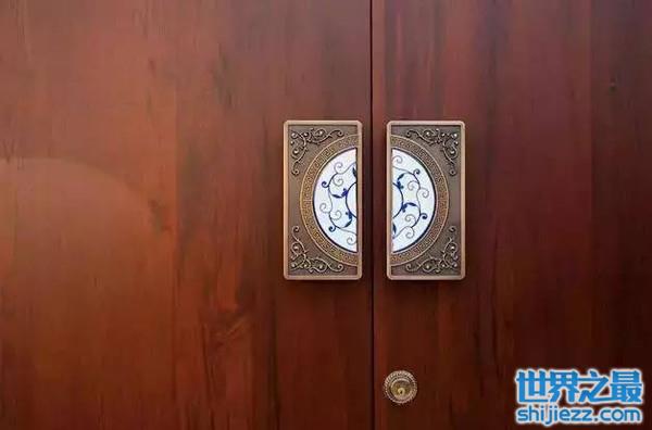 家的门是这样的。门庭所用将军门。据说是进口东南亚柚木外包铜边。把手很有特色,内嵌青花瓷板。看上去很精致。
