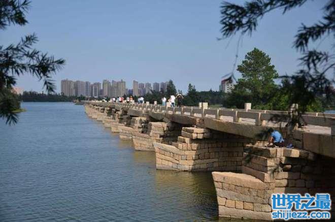 福建省泉州市有晋江安海镇和南安水头镇,此间连接着一座安平桥,有着“天下无桥长此桥”的称号,又因为长约5华里,也被称为“五里桥”。当然在现在5华里的桥梁好像不算多长,但是在那个不发达的时代,这已经是极为罕见的建筑了。安平桥建于1138年,明清年代曾多次翻修,属于古代连梁式石板平桥,桥墩用花岗岩条石交错而砌,形状不一,是世界最长的梁氏石桥。