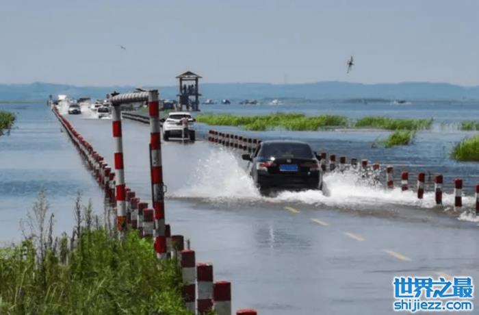 因为中国最大的淡水湖鄱阳湖进入汛期,水位上涨。整个永吴公路大湖池段会被淹没,从而形成了水天一色的唯美景观。鄱阳湖水位退下去之后,公路又重新露出水面。远远地看去,汽车从公路上开过,既刺激又浪漫。