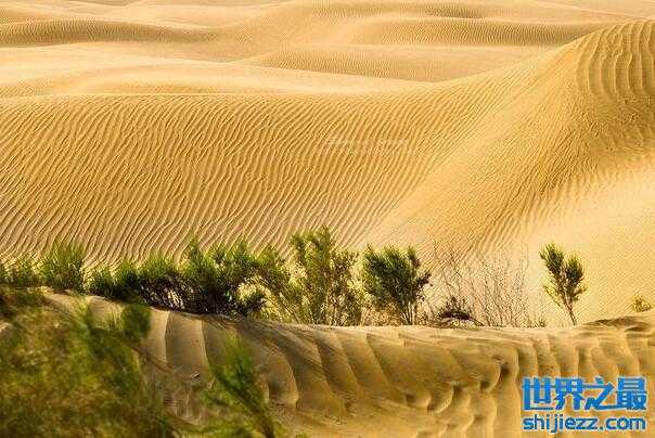 中国最大的沙漠塔克拉玛干沙漠是一片流动的沙漠,这里经常会刮起大风,整体十分震撼,同时这里也有一些植物给沙漠带来了一些绿色。