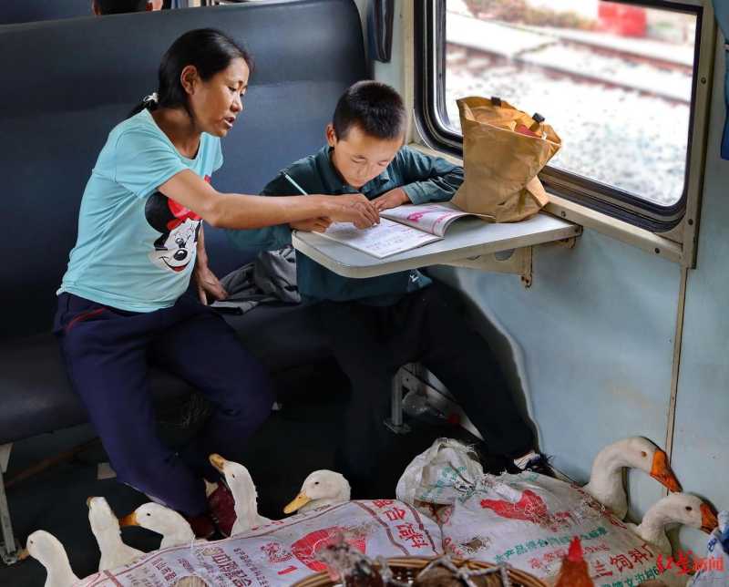 ↑慢火车上的母亲给孩子辅导作业,这张照片令胡仲平印象深刻