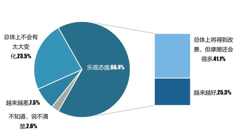 伴随着中国与全球主要国家和周边国家关系的调整,近七成(66.4%)受访者对中国未来3年所处国际环境的预期表示乐观,其中25.3%的受访者认为会“越来越好”,41.1%的人认为“总体上将得到改善,但摩擦还会很多”。另有23.5%的受访者认为“总体上不会有太大变化”,只有7.5%的受访者认为会“越来越差”。