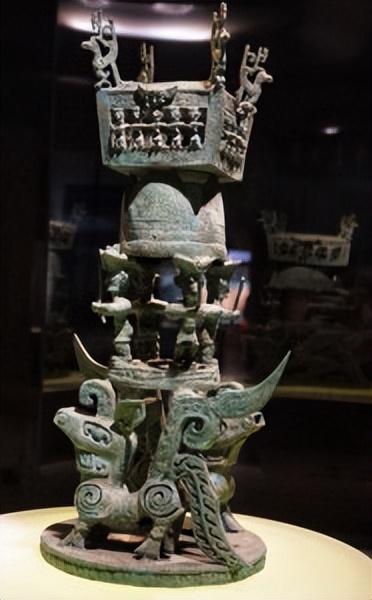 世界上最早、树株最高的青铜神树。高384公分,三簇树枝,每簇三枝、共九枝,上有27果九鸟,树侧有一龙缘树逶迤而下。具推断可能为古神话传说中扶桑树。