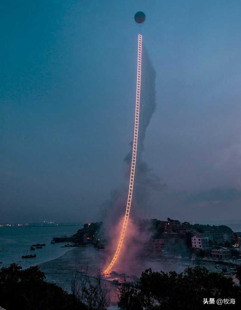 2015年,蔡国强带领团队奉献了一场惊艳全球的烟花艺术作品:《天梯》,天梯烟花的设计思路可谓别具一格,巧妙地利用一个直径25m、体积6200m³的巨型热氦气球将梯顶拉到空中,底部则连接地面,营造出了一种凡人通天的意境。
