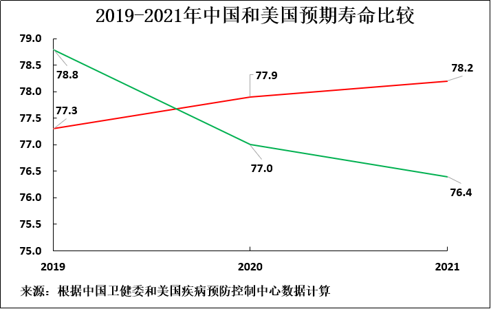 如果全球新冠人均死亡率与中国一样低,那么全球新冠死亡人数将从670万人降至2.9万人,美国死亡人数将仅为1200人,而不是110万人。新冠疫情期间,美国的糟糕表现导致美国人均预期寿命在2019-2021年间下降两岁多,中国人均预期寿命则稳步上升至78.2岁,超过了美国的76.4岁。
