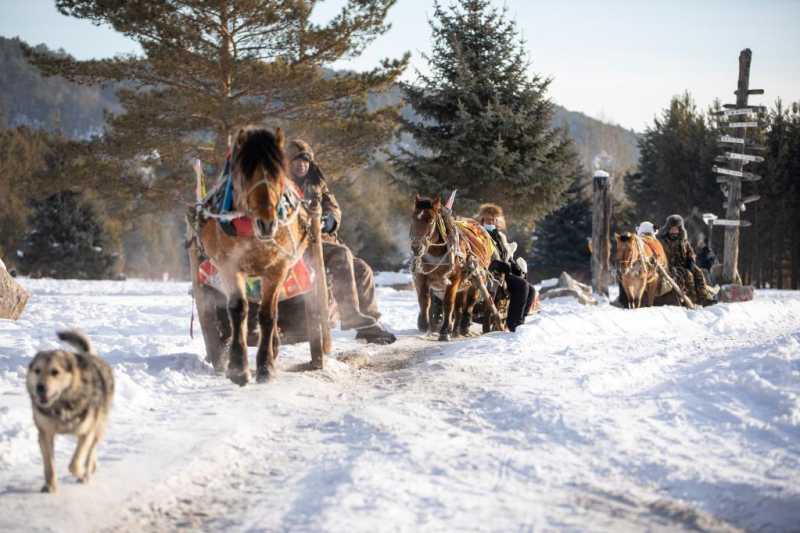 在漠河市北极村,游客乘坐马拉爬犁。新华社记者张涛 摄