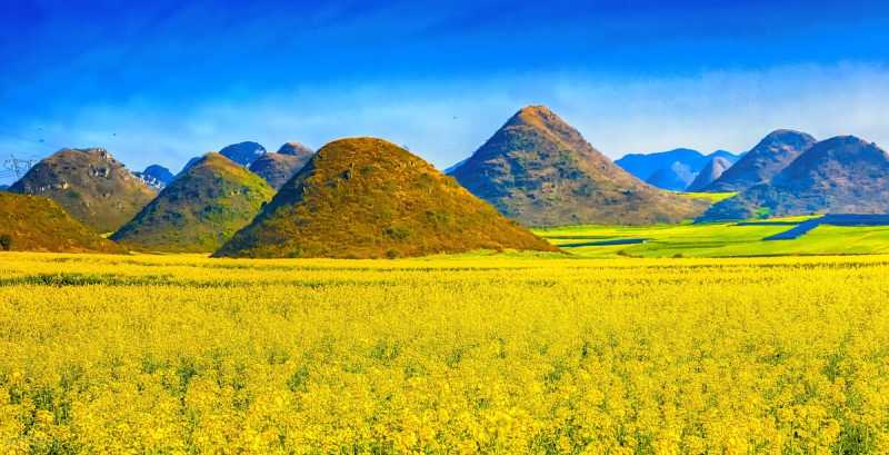 盛开的无尽油菜花的壮丽景色使罗平县成为春天中国最美的地方之一。超过20万亩(32947英亩)的油菜花在微风中摇曳,形成了风景如画的景象,小镇像金色海洋中的神秘岛屿一样矗立。这绝对是一场视觉和相机的盛宴。