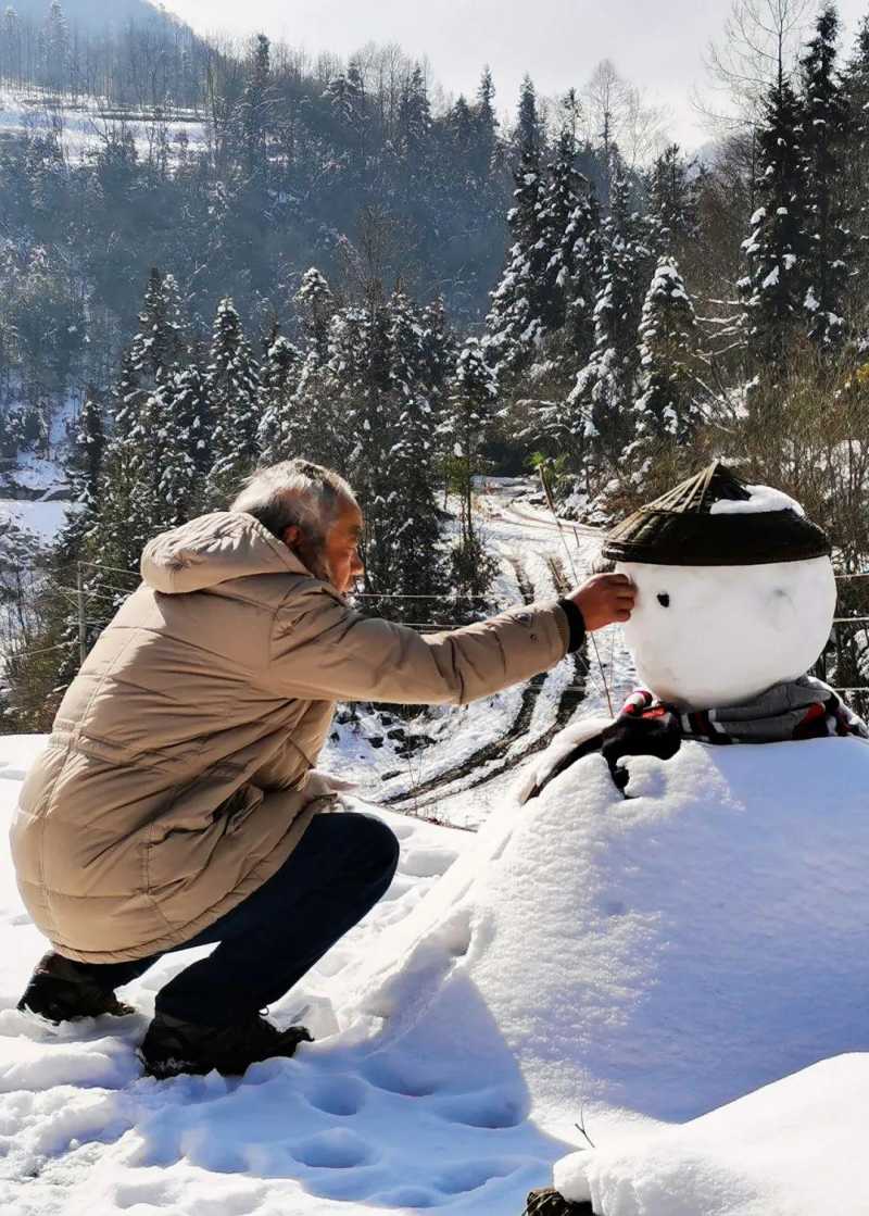 重庆巫山梨子坪森林公园内银装素裹,游客堆起了雪人