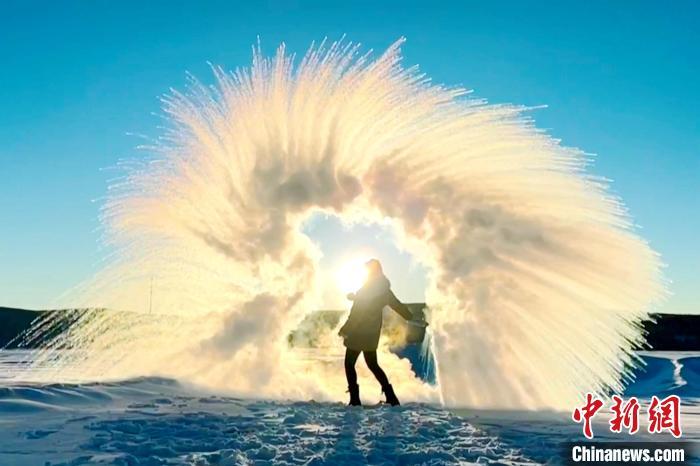 游客体验泼水成冰。 邵天李 摄