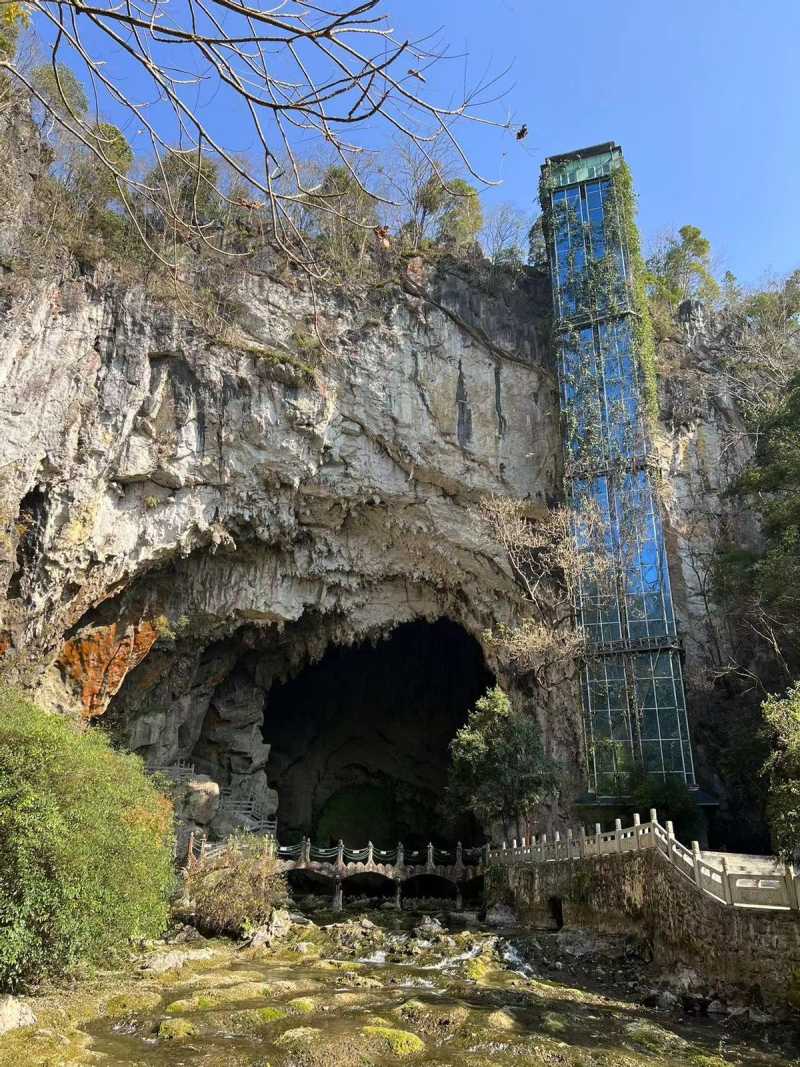 来到这里首先会被一个高耸入云的观光电梯吸引,在这岩壁之间,这个由玻璃和钢筋打造的观瀑天梯格外鲜艳,天空的蔚蓝色映照在每一块锃亮的玻璃上,闪闪发光。
