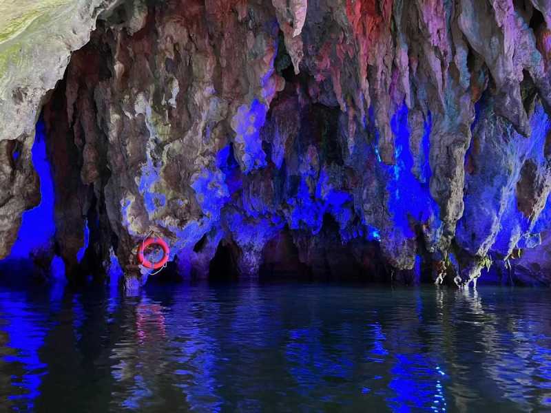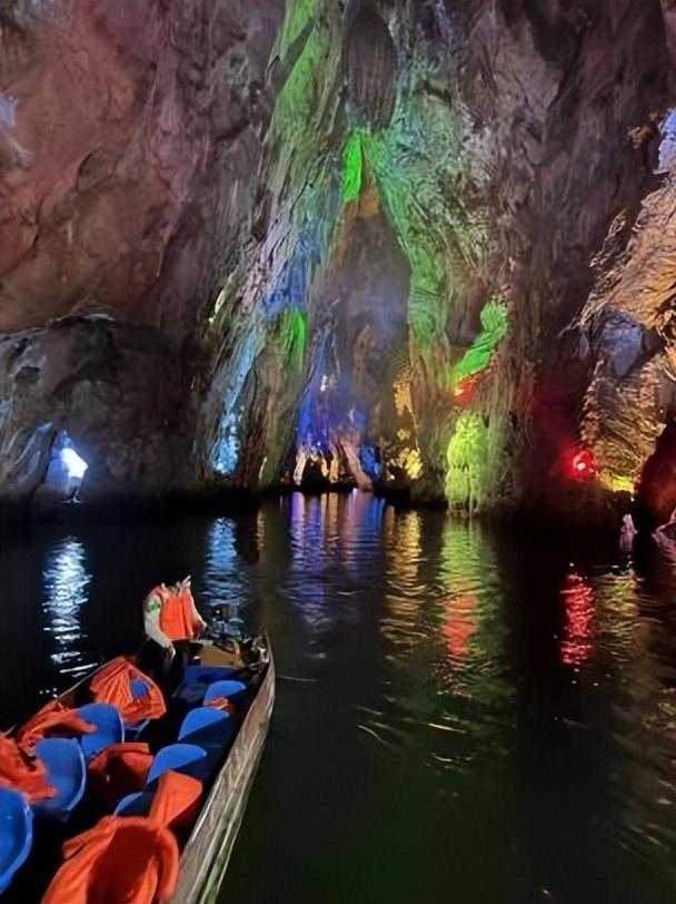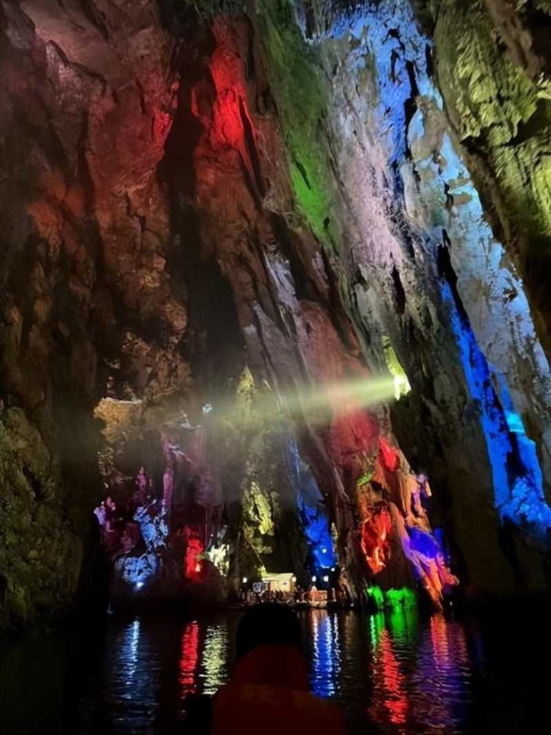 越往深处驶去,洞中的景色堪称奇绝,抬头望去,这里变成了一片绚烂的星空,平静的水像极了一面镜子,彩色的光交织着,像极了曾经绚烂的梦。