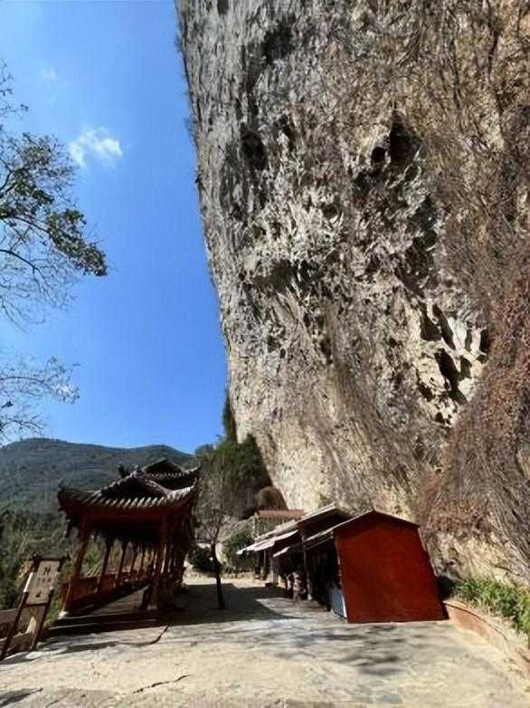 商铺对面有一个休憩的亭子,抬头望去,这光滑的悬崖庞大得有些惊人,但是如今还能够看见一些枯藤攀岩而上,在春夏季,这座崖壁将会被一片绿意覆盖。