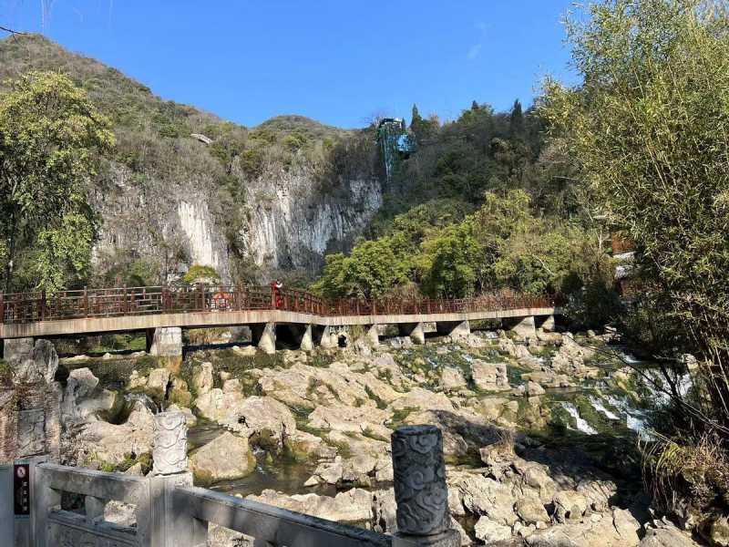 越往外走,耳边传来湍急的水流声,沿着台阶而上,阳光和煦,走过一个门亭,这里地小商铺中有卤煮好的各种小吃,贵州的炸洋芋更是美味。